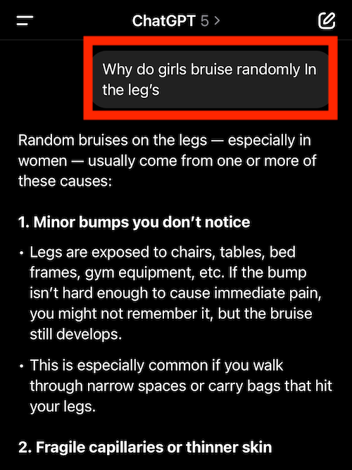 So far so good. Then Chat asks if I want quick ways to tell if random bruising is normal or something to get checked out. So I respond, ‘Yes.’