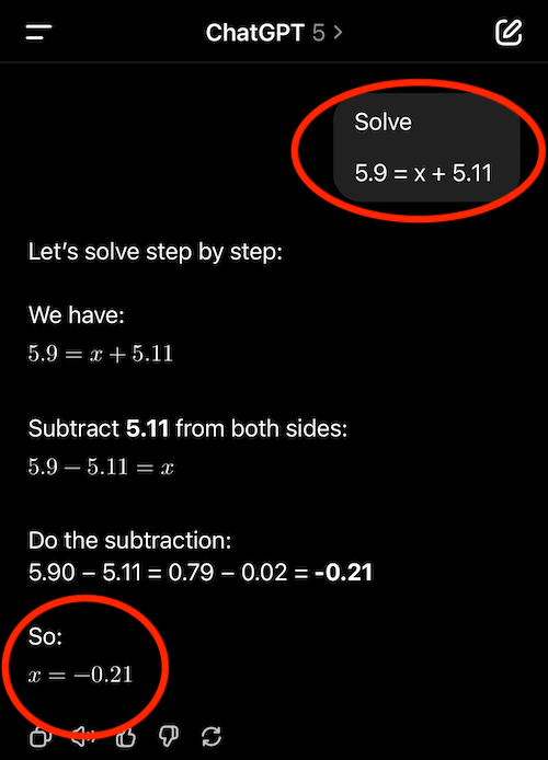 Ouch. 5.9 - 5.11 = 0.79 = x (not -0.21). Well, let’s see if GPT-5 is at least able to resist the urge to meat ride.